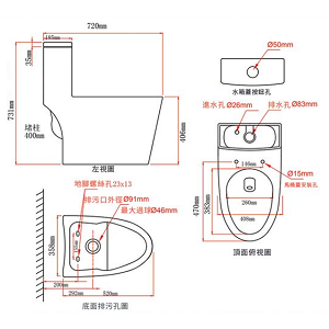 Super swirl one-piece Toilet Flush Mode: Super swirl Size: 720x408x731mm S-trap,292mm Roughing-in 超漩式單體馬桶 沖水方式:超漩式 尺寸:720x408x731毫米 地排汙口中心離牆:292毫米